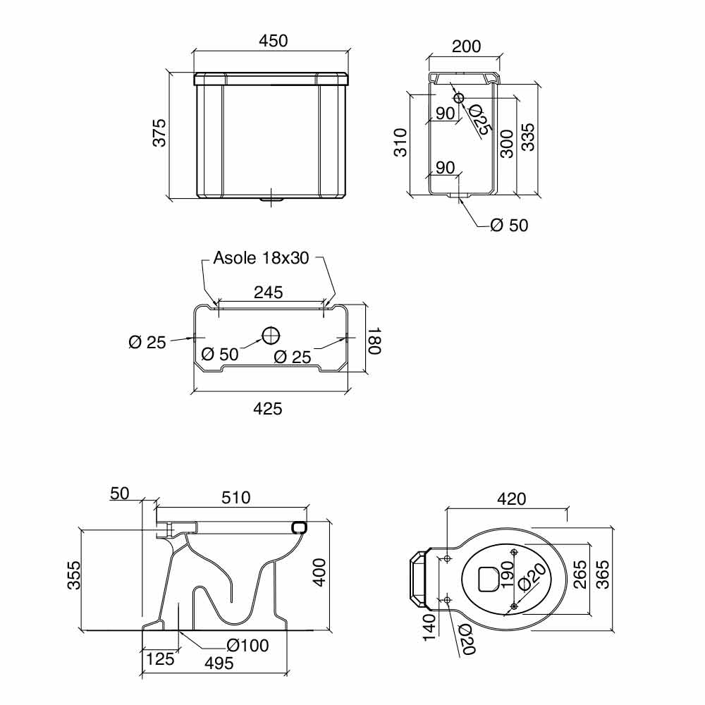 Podea WC în stil clasic, cu cutie ceramică Marwa, albă, fabricată în Italia.
