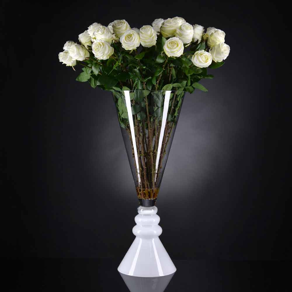 Vaza de interior din sticlă transparentă cu bază albă realizată cu prelucrare 100% Made in Italy . Un complement caracterizat printr-o estetică simplă și curată subliniată de o eleganță extremă și finisaje versatile care îi permit utilizarea în orice mediu cu un stil rafinat . Un design ideal pentru cele mai variate medii, de la mobilierul de casă până la cel al hotelurilor, restaurantelor, zonelor contract, spa-urilor, dar și ca decor pentru evenimente și nunți.