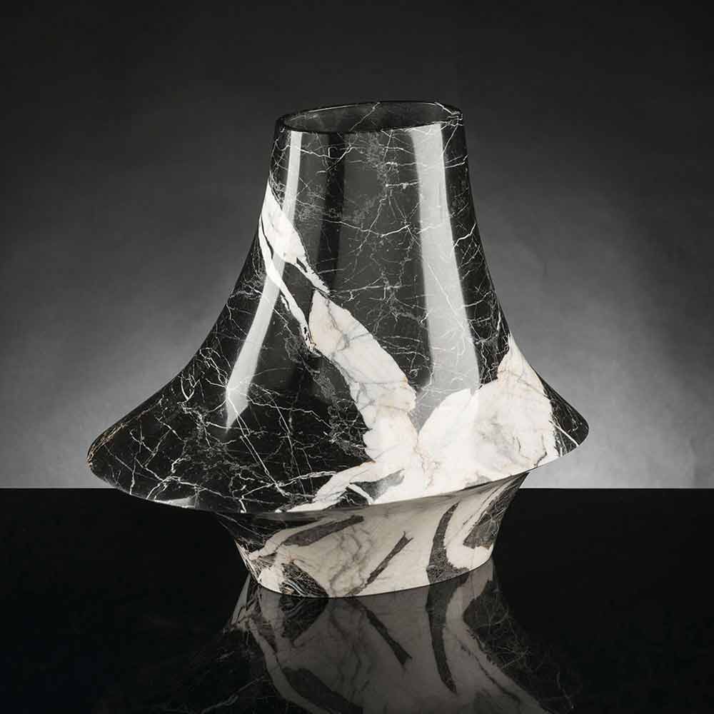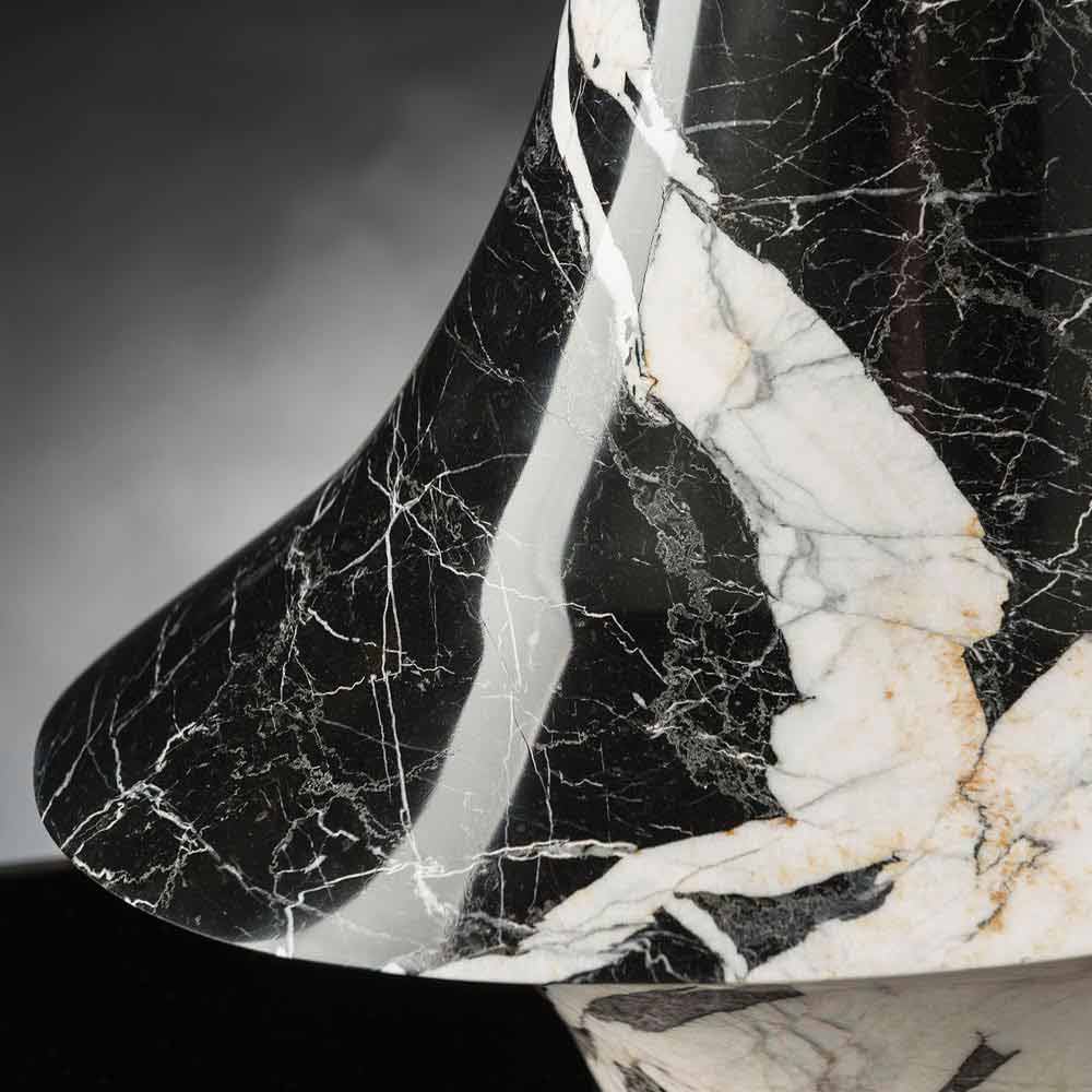 Vaza ornamentală interioară din marmură neagră cu vene albe printr-o producție 100% Made in Italy . Producția sa are loc prin prelucrarea pietrelor naturale cu pantografe pe 5 axe care permit obținerea unor forme mai complexe decât volumele simple de rotație. Această piesă elegantă de mobilier provine din uniunea dintre studiul fenomenelor naturale și interacțiunea materialelor folosite cu tehnologia umană pentru a da viață unui stil unic și avangardist de mobilier. Rezultatul este un element decorativ exclusiv capabil să îmbogățească orice mediu cu o estetică modernă și rafinată cu personalitate. Un stil ideal pentru cele mai variate medii, de la mobilier de casă până la cel al hotelurilor, restaurantelor, spațiilor contractuale, spa-urilor, dar și ca decor pentru evenimente și nunți.