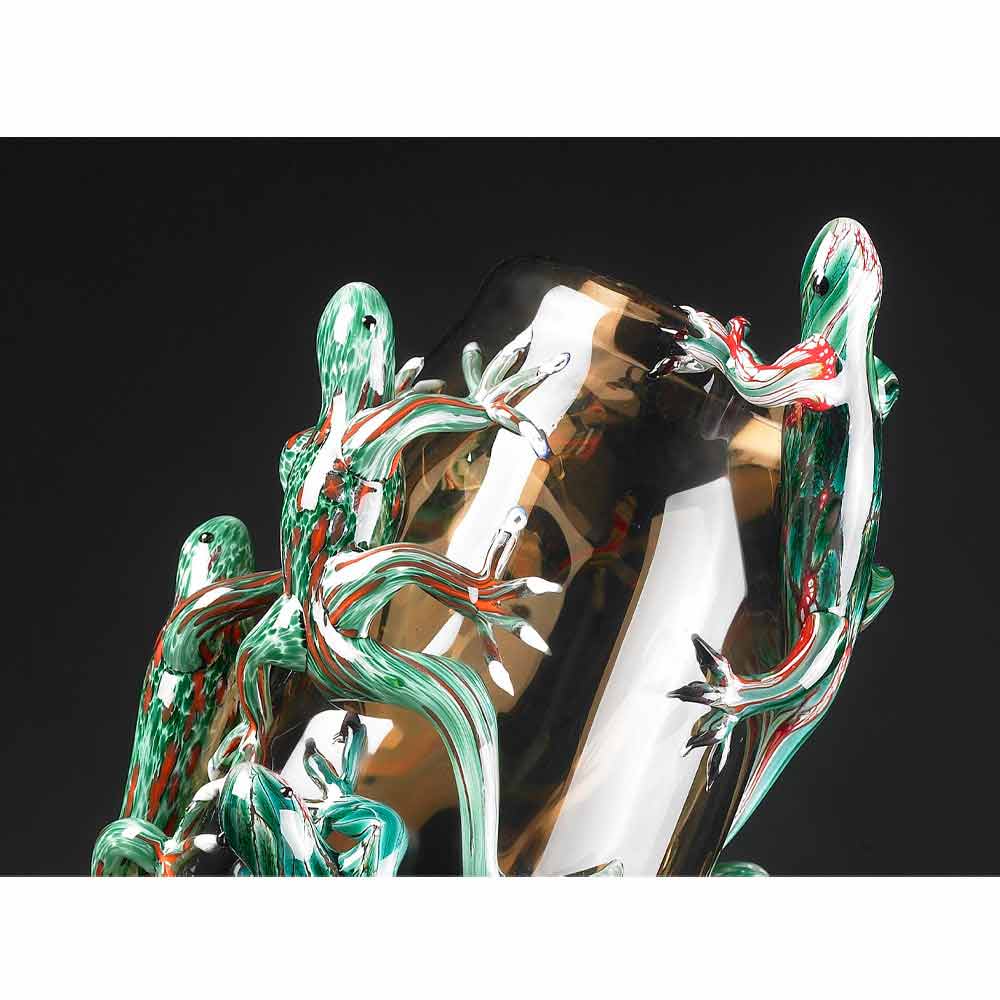 Vaza de interior realizată manual în Italia în sticlă maro realizată manual de meșteri producători de sticlă care au fost experți în sector de generații îmbogățite cu 8 geckos în nuanțe de roșu, albastru și verde. Particularitatea sa este reprezentată de producția artizanală care își mărește valoarea și valoarea pentru a da viață unui rezultat exclusiv și de înaltă calitate . Un element decorativ excentric pentru spațiile dvs. capabil să dea o notă originală datorită personalității sale creative puternice . Rezultatul este un obiect simplu pentru casă capabil să îmbogățească stilul oricărei case cu originalitate datorită sufletului său modern și designului avangardist .