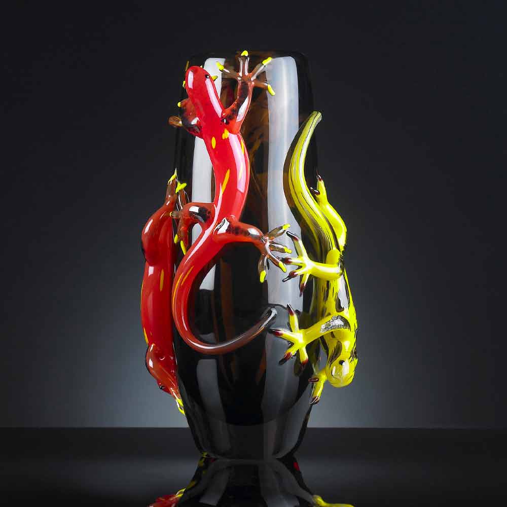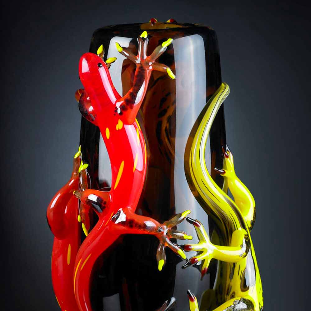 sticlă maro realizată manual în Italia de maeștrii producători de sticlă, experți în domeniu de generații, îmbogățită cu 4 gecoși în nuanțe de galben și roșu. Un element decorativ excentric capabil să dea o