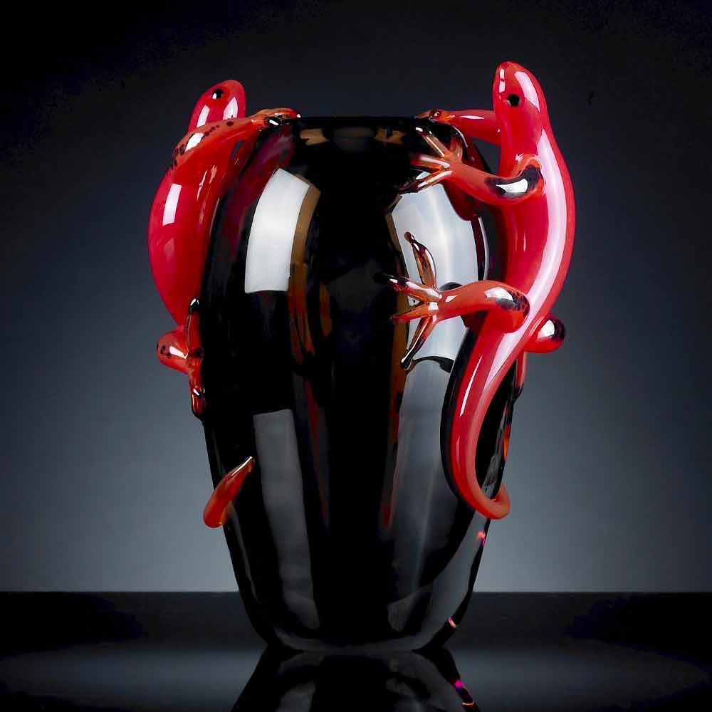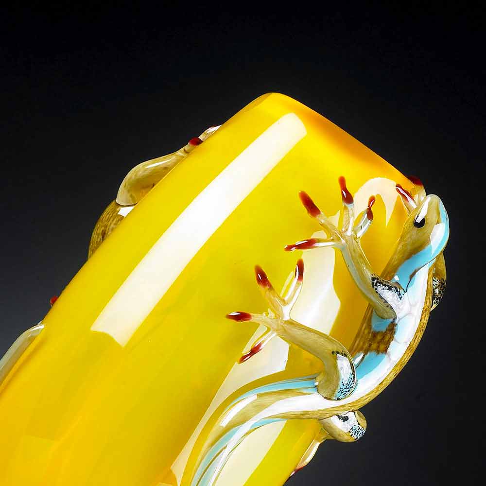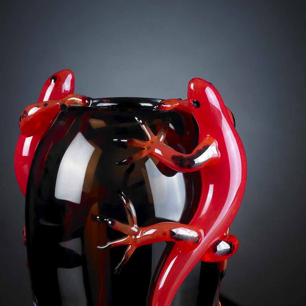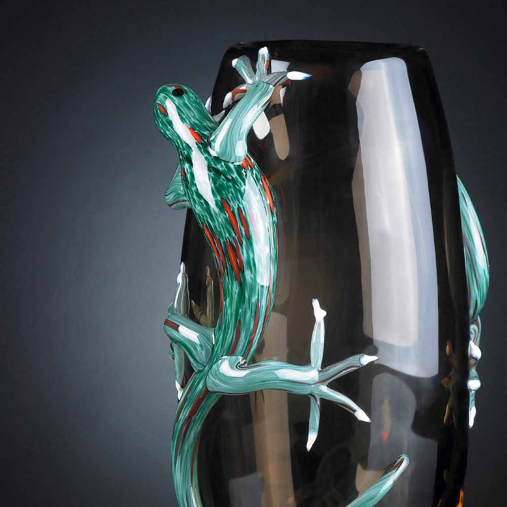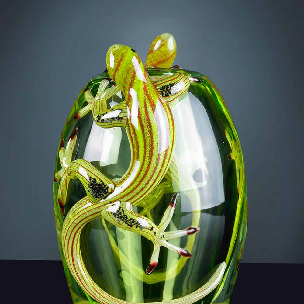 Vază de sticlă ornamentală artizanală cu 2 geckos fabricate în Italia.