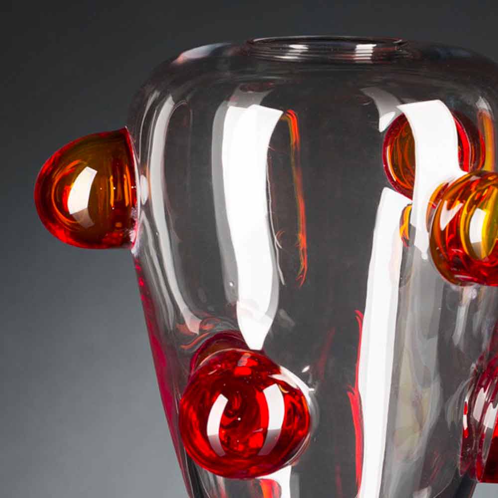 Vaza de interior elegantă din sticlă suflată transparentă de Murano cu detalii roșii printr-un proces realizat în întregime în Italia . Un complement care combină eleganța extremă a sticlei de Murano și caracteristicile sale minunate cu un design modern și plin de viață pentru a da viață unei idei de mobilier exclusivist și avangardist capabil să îmbogățească orice spațiu casnic și nu cu o notă de culoare . Un stil ideal pentru cele mai variate medii, de la mobilier de casă până la cel al hotelurilor, restaurantelor, spațiilor contractuale, spa-urilor, dar și ca decor pentru evenimente și nunți.