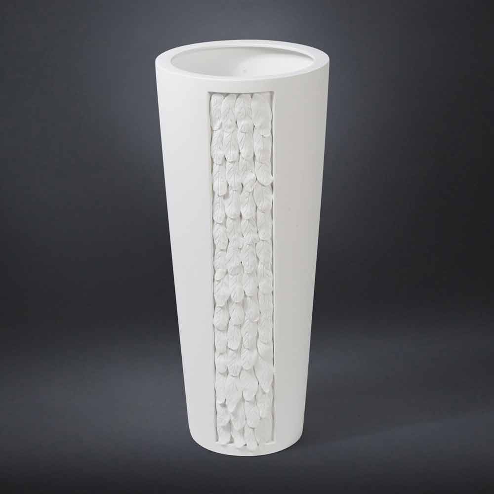 Vaza înaltă pentru interioare realizată în Italia din ceramică albă opacă printr-un proces artizanal . O estetică punctată de forme esențiale îmbogățite de un detaliu elegant cu o textură de frunze care acoperă o parte din structura vazei. Acest detaliu împreună cu finisajul rafinat ales conferă acestui complement toată personalitatea sa, făcându-l o soluție perfectă pentru spațiile caracterizate de un stil clasic . Utilizarea ceramicii și a meșteșugului îl fac un element decorativ exclusiv și rafinat, sporindu-i valoarea și subliniindu-i calitatea. O estetică ideală pentru cele mai variate medii, de la mobilier de casă la hoteluri, restaurante, zone contract, spa-uri, dar și ca decor pentru evenimente și nunți.