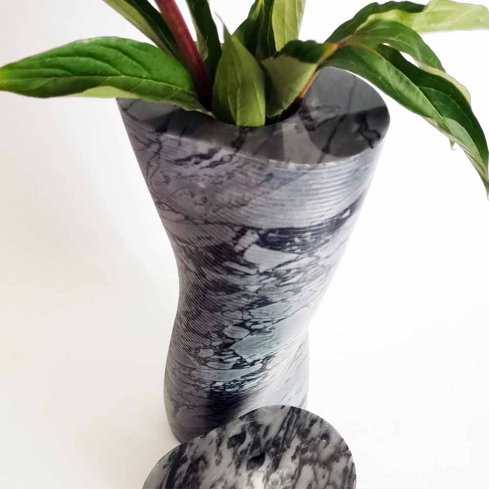 marmură Bardiglio înflorită , un material compact cu o culoare gri deschis, caracterizat prin vene gri antracit. Ideal pentru a fi folosit singur ca obiect decorativ sau chiar cu flori care pot crea un loc minunat colorat în medii cu mobilier modern și elegant. Combinația de materiale și tehnici utilizate împreună cu munca minunată a meșterilor permit obținerea unui produs final de înaltă calitate, cu atenție la detalii și perfect pentru medii cu un gust contemporan și sofisticat.