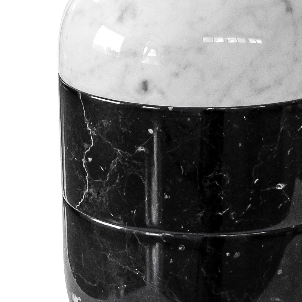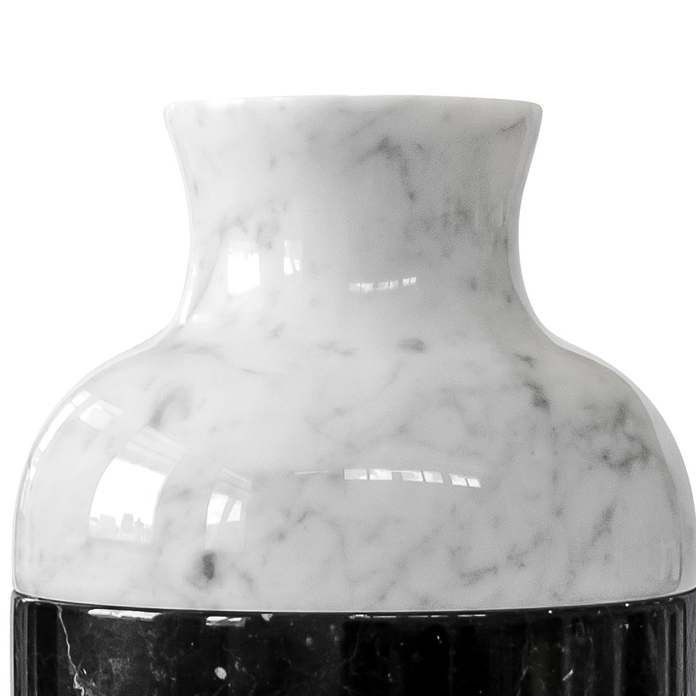 Această vază decorativă prezintă un design artizanal și luxos împărțit în 3 părți, realizată în întregime din marmură albă de Carrara și neagră Marquinia satinată.