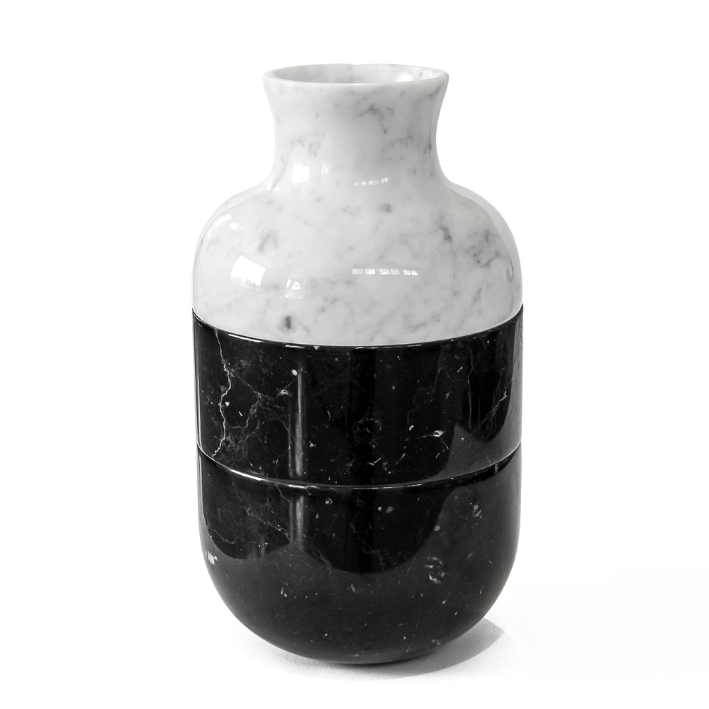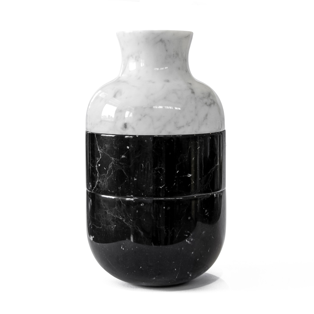 Vaza decorativa din 3 parti din marmura alba de Carrara si Marquinia neagra fabricata in Italia.