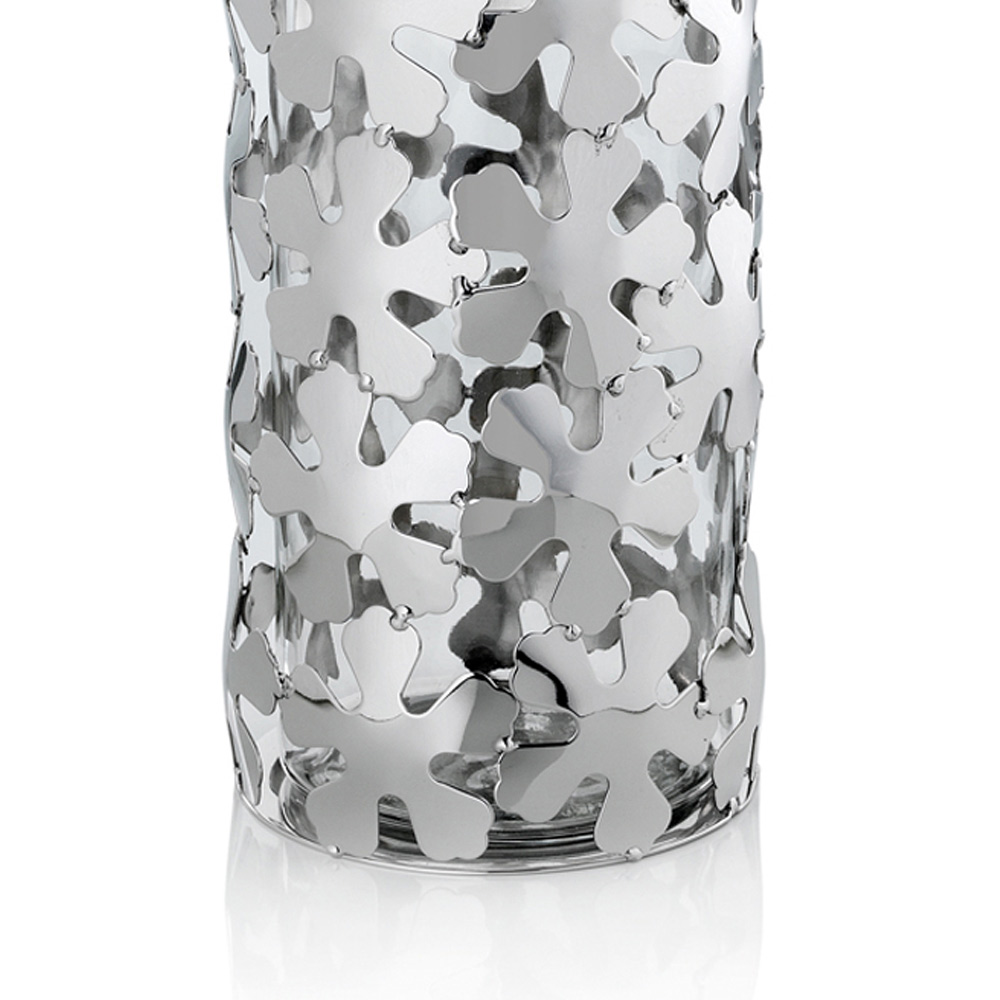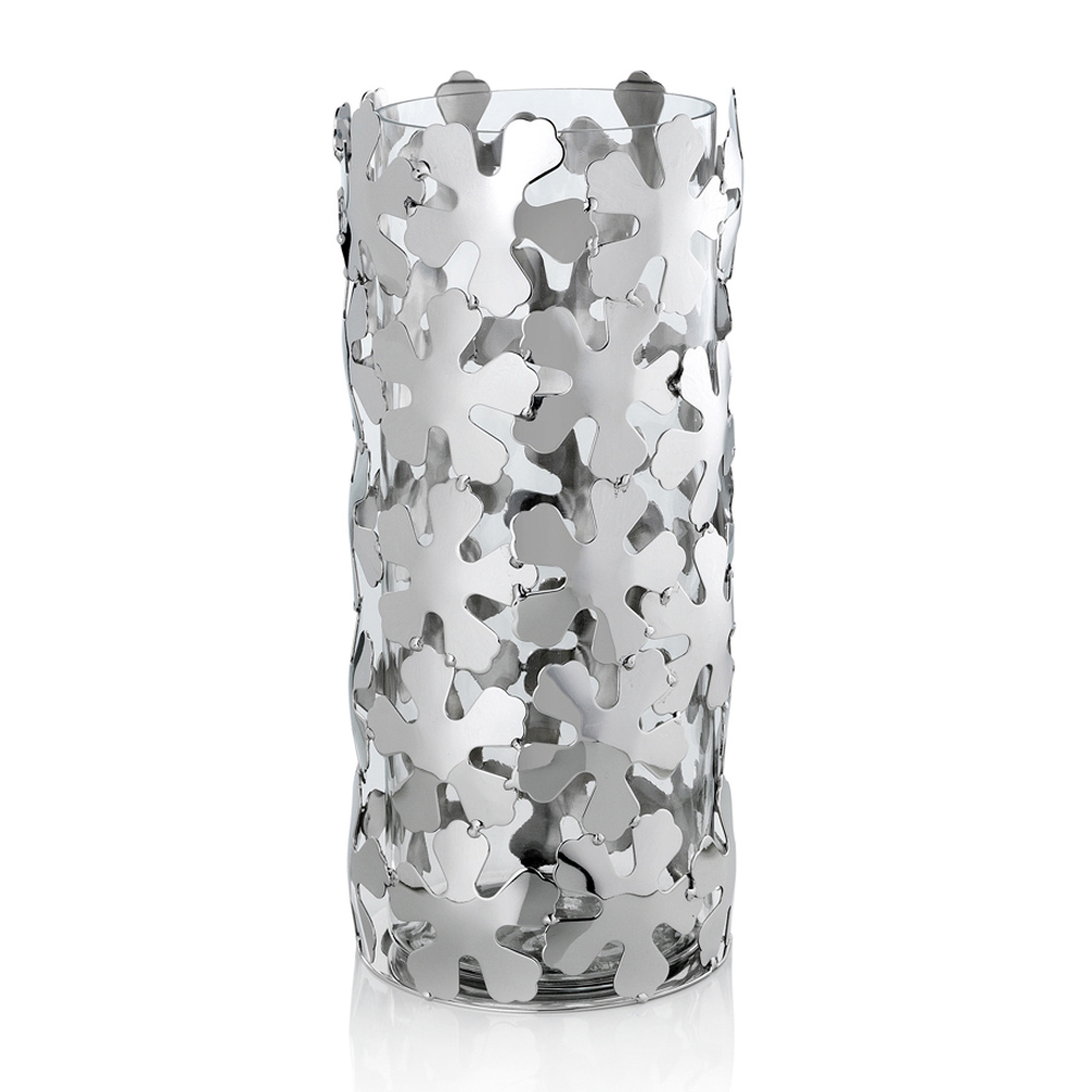 Vază decorativă cilindrică din sticlă și metal placat cu argint cu flori, lux.