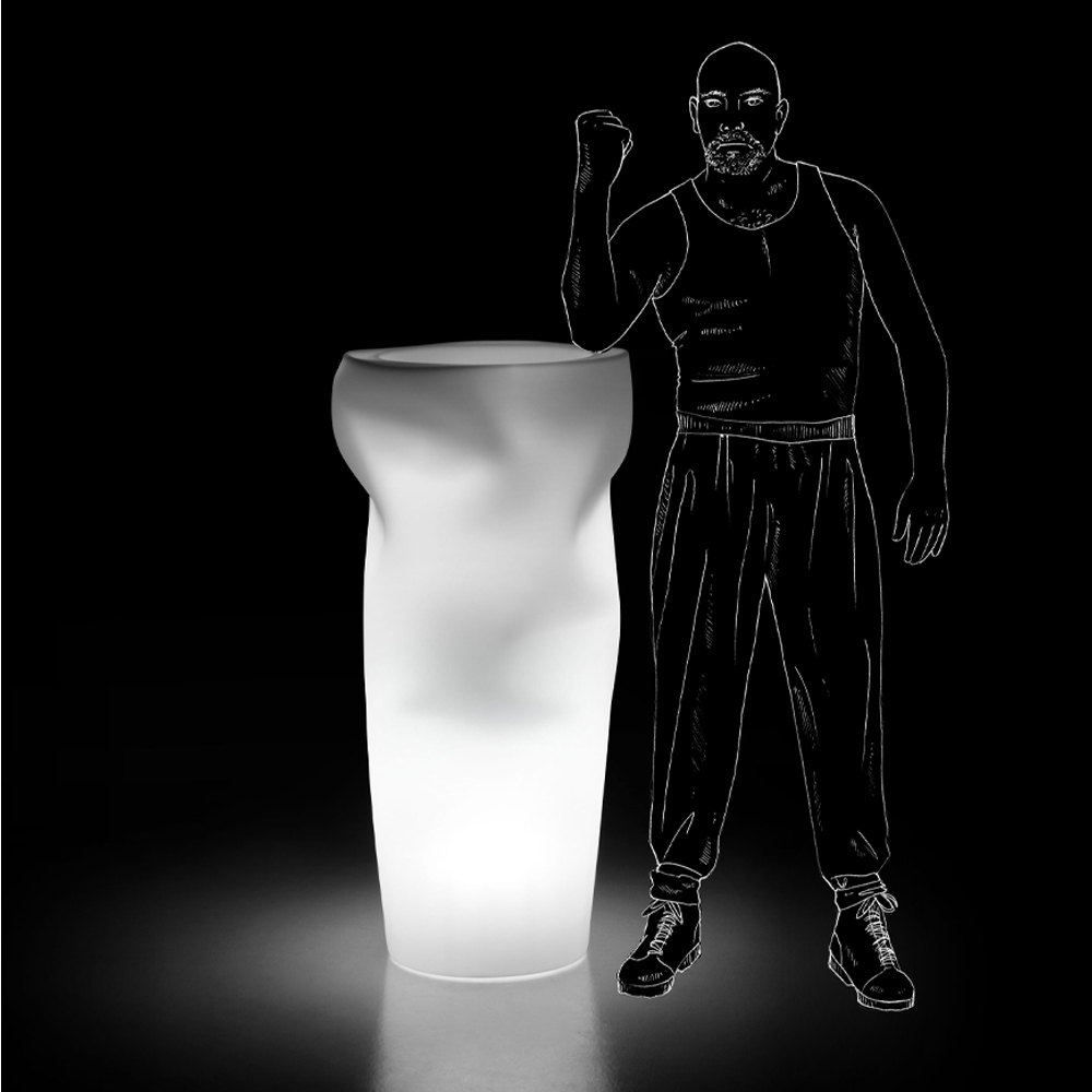 Vază de grădină luminoasă fabricată în întregime în Italia din polietilenă colorată cu finisaj mat complet cu kit de lumină LED . O piesă de mobilier originală și versatilă care provine dintr-un anumit proces în care vaza este supusă unui tratament de "compresie" atunci când materialul este încă parțial maleabil sau imediat după ce a fost extras din matriță. Astfel se naște un element industrial care preia din când în când o altă estetică printr-o acțiune artizanală care produce piese unice. Fluiditatea formelor neobișnuite care rezultă contribuie la difuzarea unei lumini moi, primitoare și mereu diferite pentru fiecare lampă, unică, dar serială datorită iluminării cu LED-uri practice și funcționale care îi subliniază valoarea și rafinamentul. Complet cu bază de stabilizare și fixare și tub de drenaj .