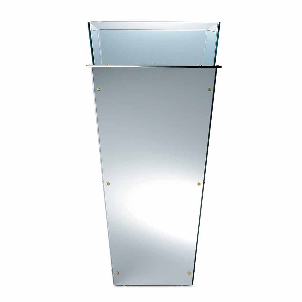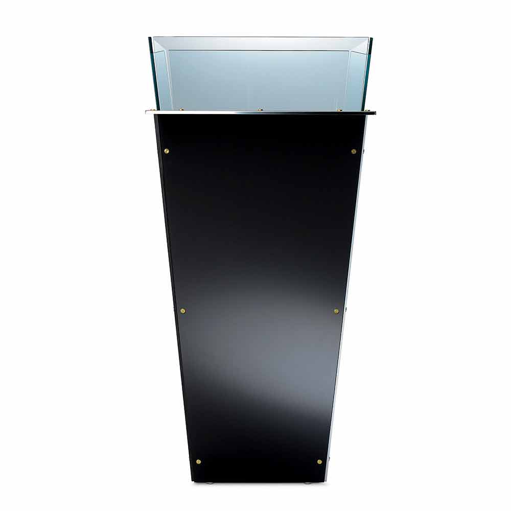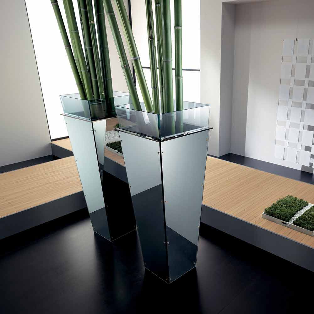 Această vază liberă disponibilă în diferite dimensiuni se caracterizează prin panouri laterale interschimbabile în mai multe finisaje, cum ar fi: sticlă lăcuită neagră, sticlă lăcuită albă, oglindă sau piele.