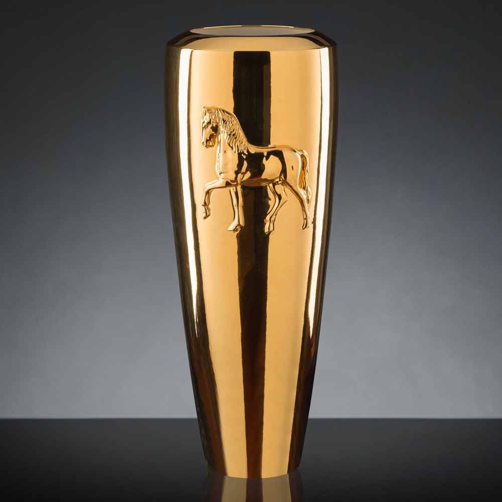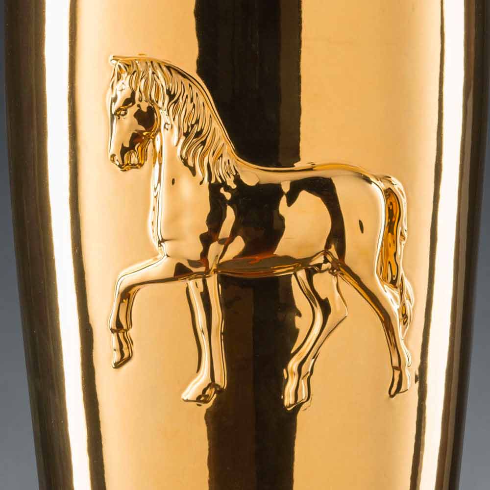 Vază ornamentală înaltă din ceramică cu finisaj auriu lucios de 24k realizat manual în Italia de meșteri care sunt experți în acest sector de generații. O piesă de mobilier unică, a cărei structură este marcată de forme simple îmbogățite de decorul frontal care îi subliniază unicitatea. Culoarea specială aleasă îl face, de asemenea, extrem de elegant, capabil să completeze mobilierul din jur cu personalitate. Utilizarea ceramicii și a meșteșugului își măresc valoarea și valoarea pentru a da viață unui rezultat exclusiv și de înaltă calitate . Un design ideal pentru cele mai variate medii, de la mobilierul de casă până la cel al hotelurilor, restaurantelor, zonelor contract, spa-urilor, dar și ca decor pentru evenimente și nunți.