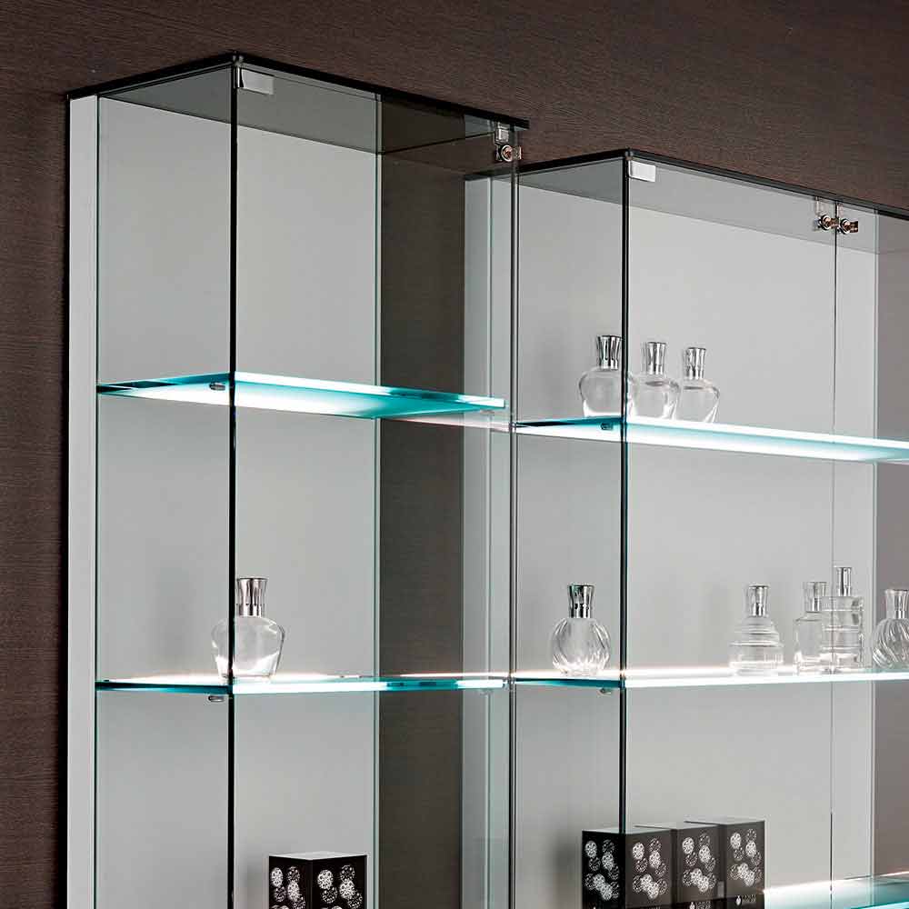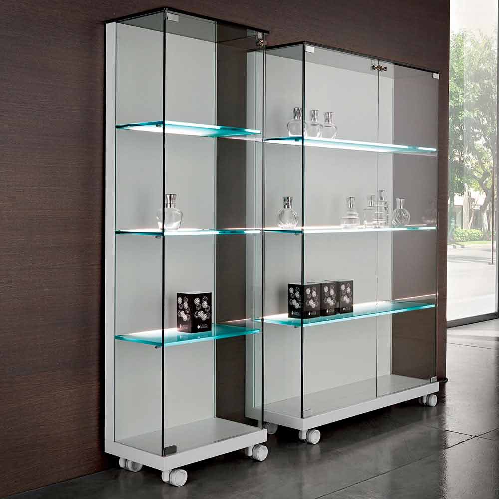 Vitrina cu două uși cu roți pentru a facilita mișcarea este realizată din sticlă transparentă temperată și o structură din lemn lăcuit alb mat.