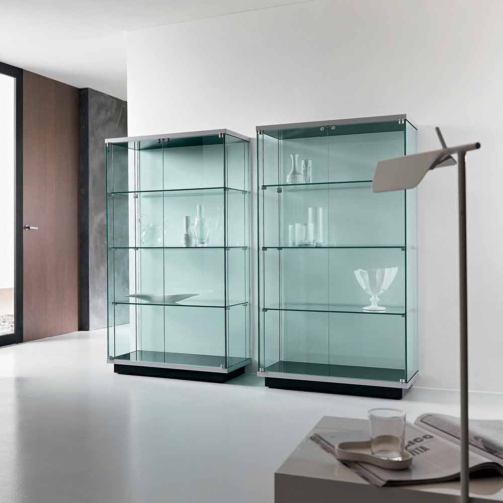 Vitrina cu două uși cu încuietoare este realizată în întregime din sticlă transparentă temperată cu trei rafturi cu bază, vârf și soclu din lemn lăcuit negru.
